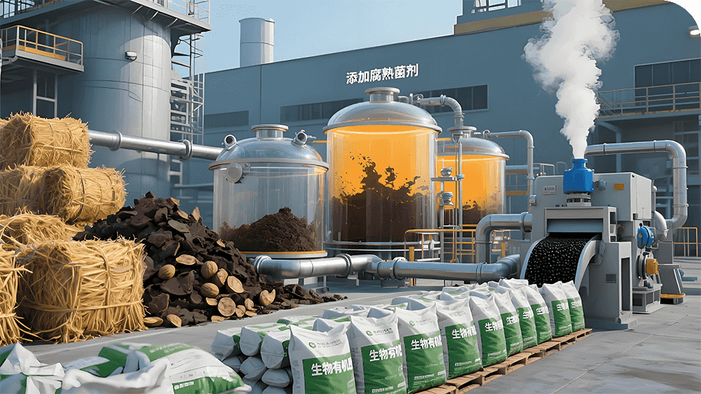 生产原料/ Production Materials将收集的秸秆、核桃皮、畜禽粪污等原料加入腐熟菌剂发酵,形成发酵腐熟有机肥,再添加生物菌剂混合,进行干燥冷却造粒等形成高等级生物有机肥。