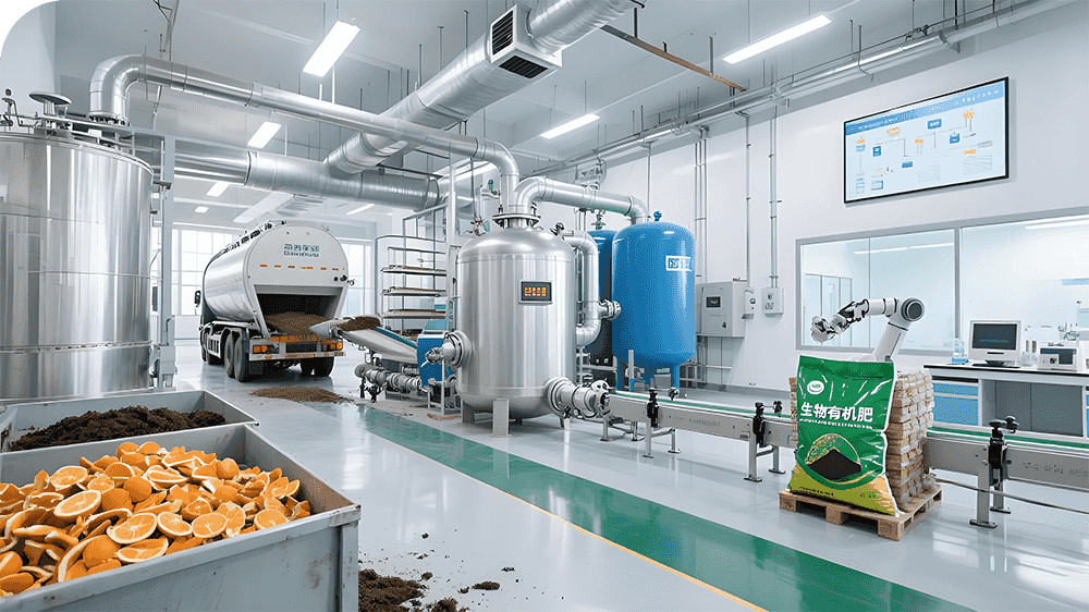工艺流程/ Process桔皮渣、畜禽粪污 -> 发酵腐熟有机肥和菌剂 -> 混合 -> 干燥、冷却 -> 检验 -> 包装 -> 成品